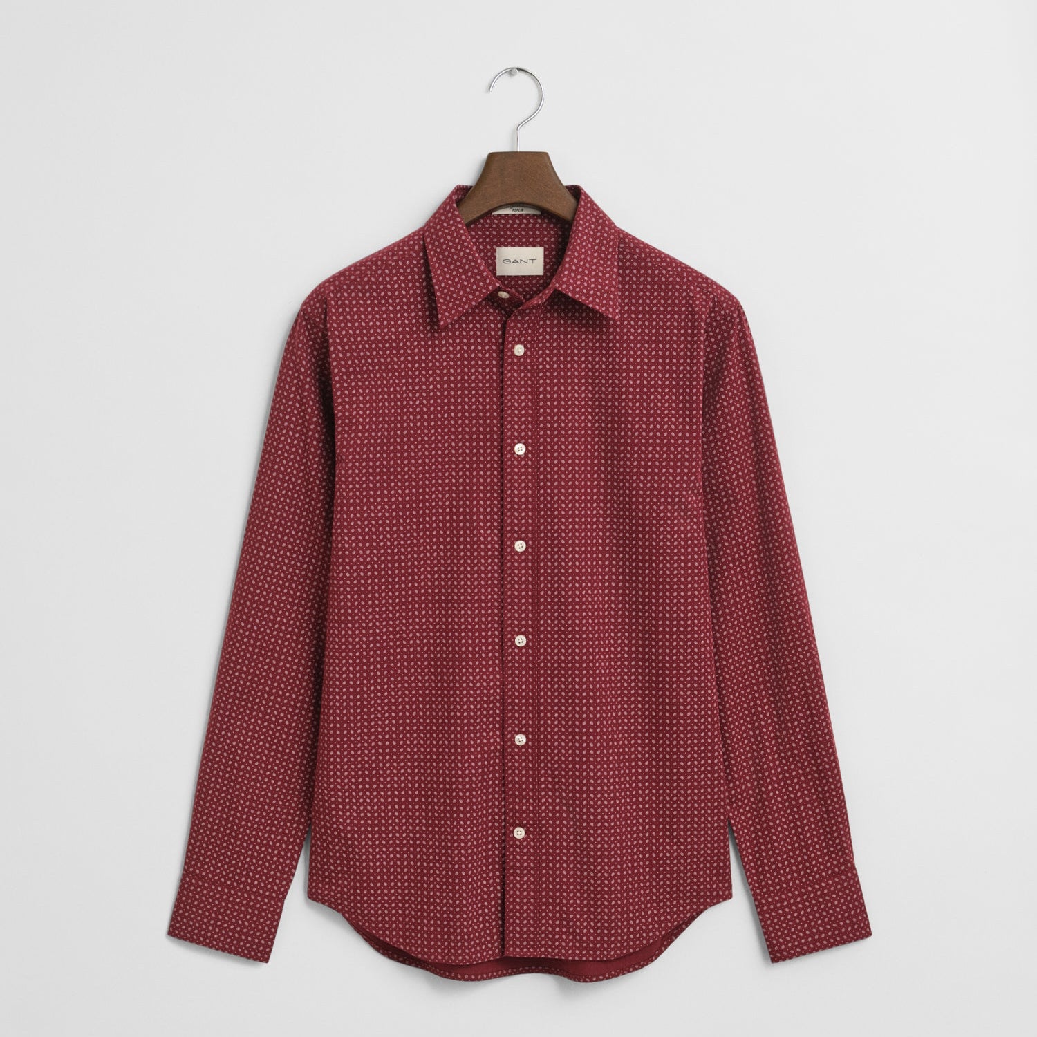 This long-sleeved shirt, made from 100% cotton, is tailored for a regular fit and showcases a stylish all-over micro print pattern. It features a button-down collar, adjustable cuffs, a curved hem, and an embroidered GANT shield graphic on the chest.