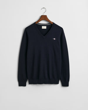 This durable and sophisticated sweater from Gant is crafted in 100% cotton. Cut for a regular fit, it features a V-neck and ribbed detailing at the hem and cuffs. This piece is accented with a Gant shield graphic embroidered at the chest.